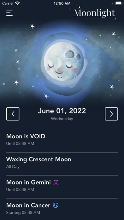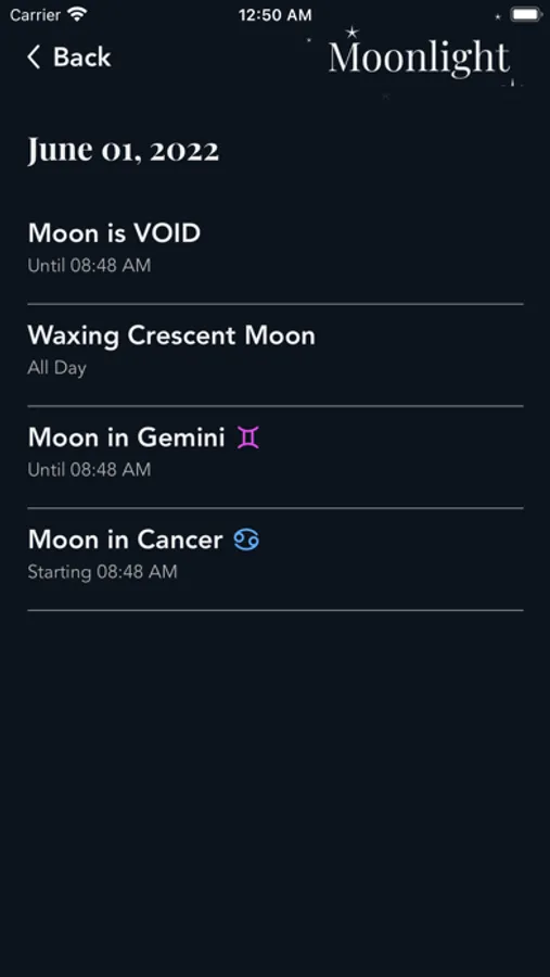 Some days the moon never goes void, other days the moon will go void for a few minutes, and still other days the moon will be void for several hours—possibly for the entire day or, in rare cases, for several days. Every day is unique, so the void is never repeated in the same way, the reason you need Susan’s Moonlight app.