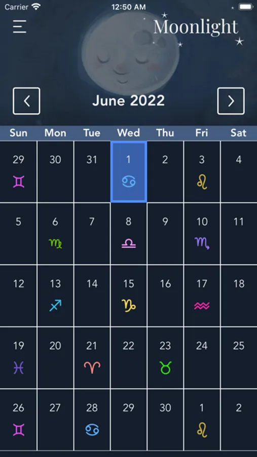 • It takes the moon 2.5 days to travel through one sign, so the app’s simple calendar reveals which zodiac sign the moon is traveling in for each day and the exact time it changes signs. Some signs that the moon travels through are especially favorable for certain actions—find out the details.