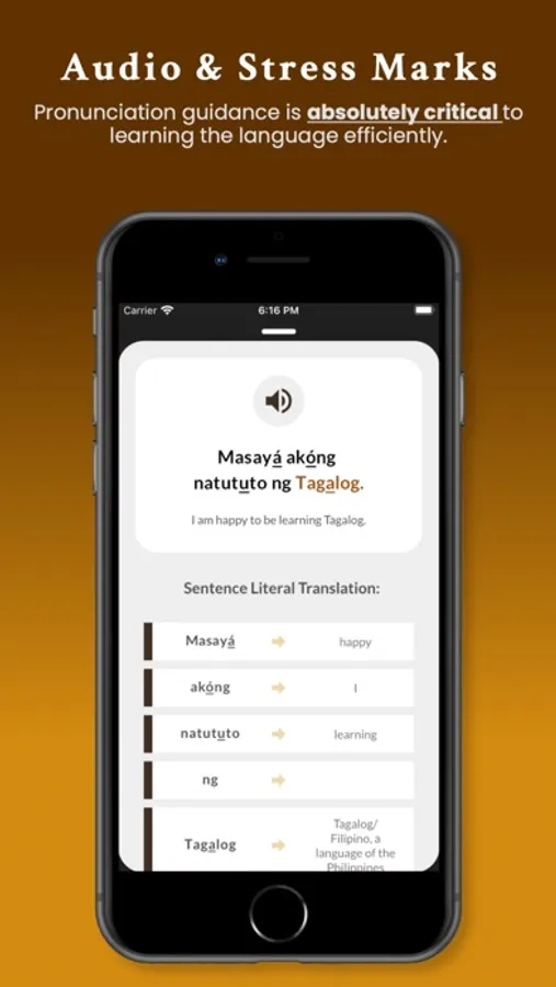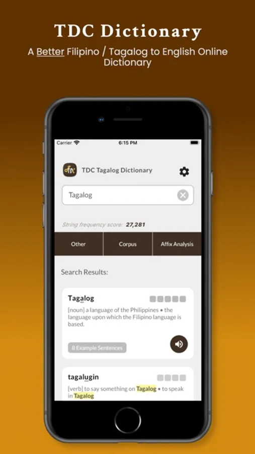 For Intermediate and Advanced learners, this app includes advanced features such as word frequency indicators, an affix analysis program to suggest which affixes may be in use with any word you encounter, and a large searchable corpus of Tagalog texts showing real-world word use.