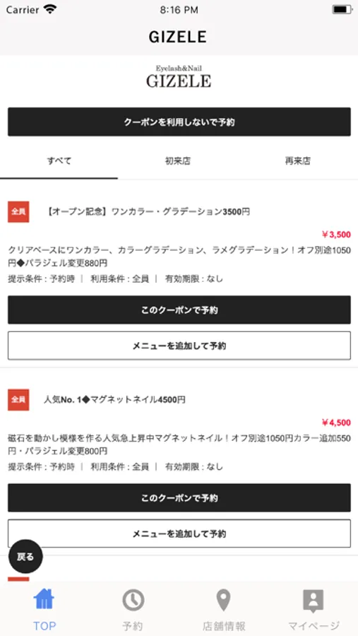 お得なクーポンが配信されます。ネット予約時にクーポン利用での予約も可能なので来店時もスムーズに施術頂けます。