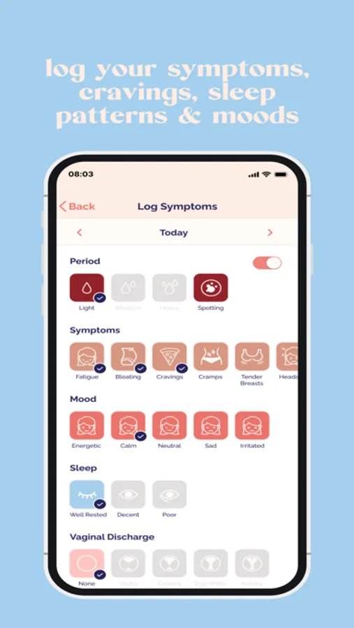 Log symptoms daily to get the most accurate predictions and recommendations for your cycle. Easily record your period, symptoms, mood, sleep quality, discharge, sexual activity.
