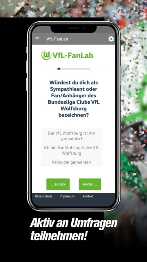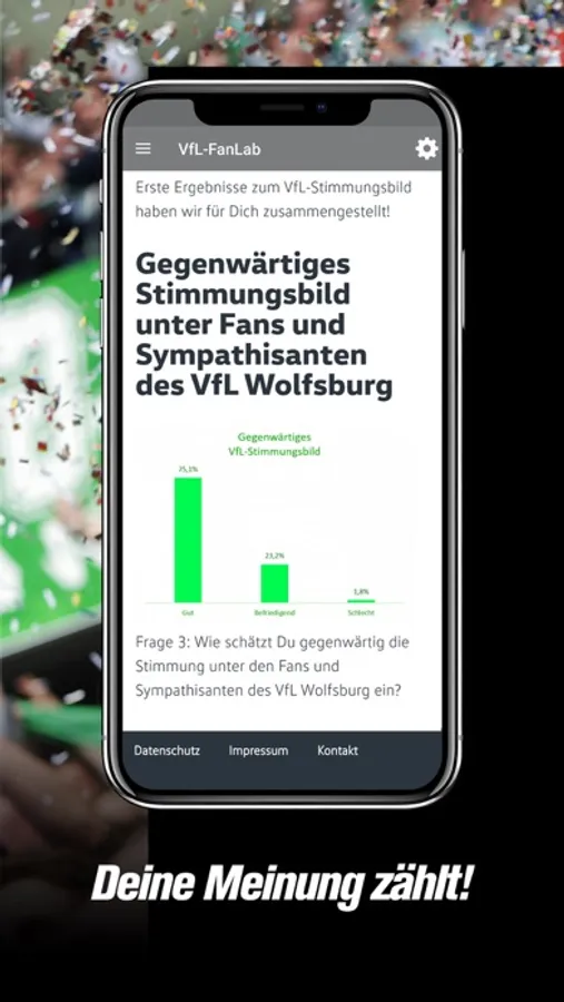 As a registered member, you will receive regular e-mail invitations to current surveys. The range of topics is broad. Stay tuned for interesting and varied questions on trends, media, products and services related to VfL Wolfsburg.