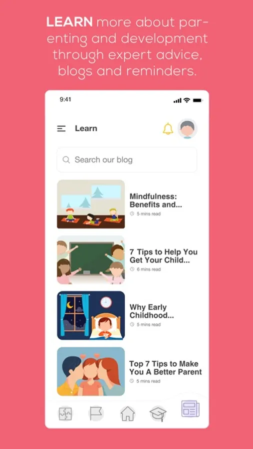 - LEARN more about parenting and development through expert advice, blogs and reminders.