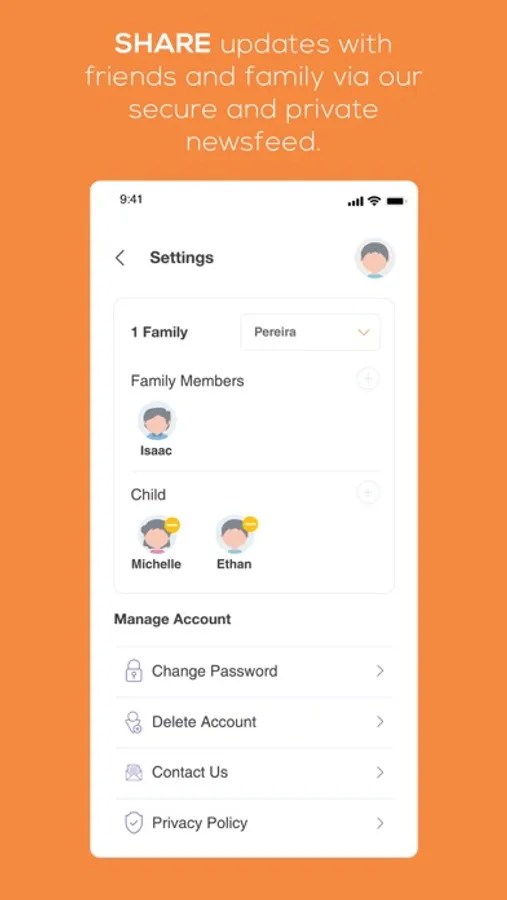 - SHARE updates with friends and family via our secure and private newsfeed.
