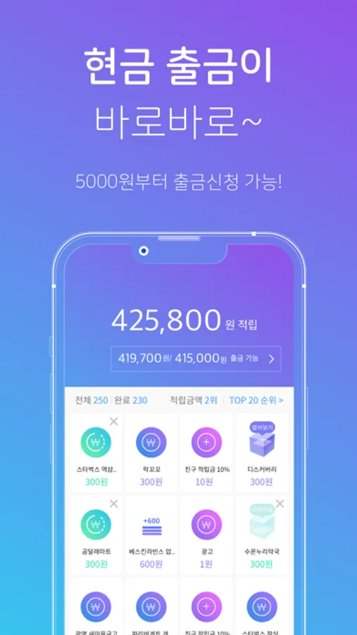 5000원 이상 적립 시, 원하는 계좌로 즉시 출금 신청 가능!