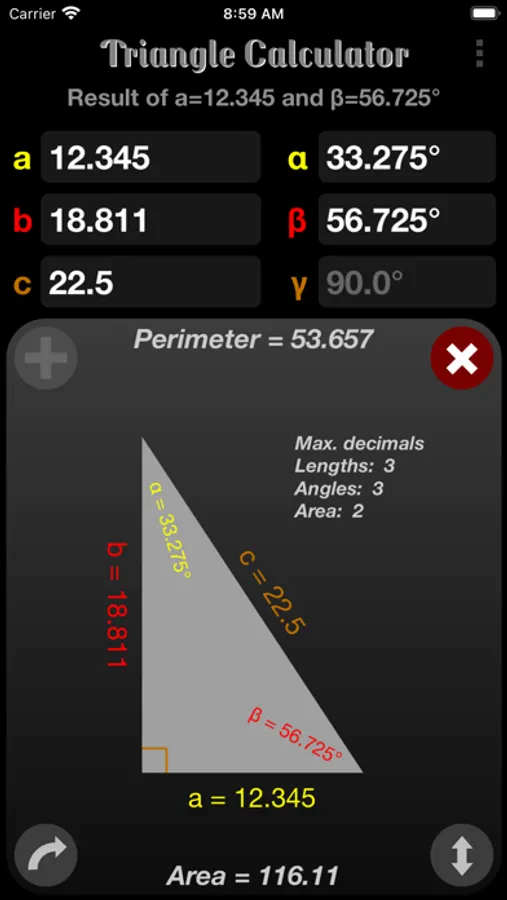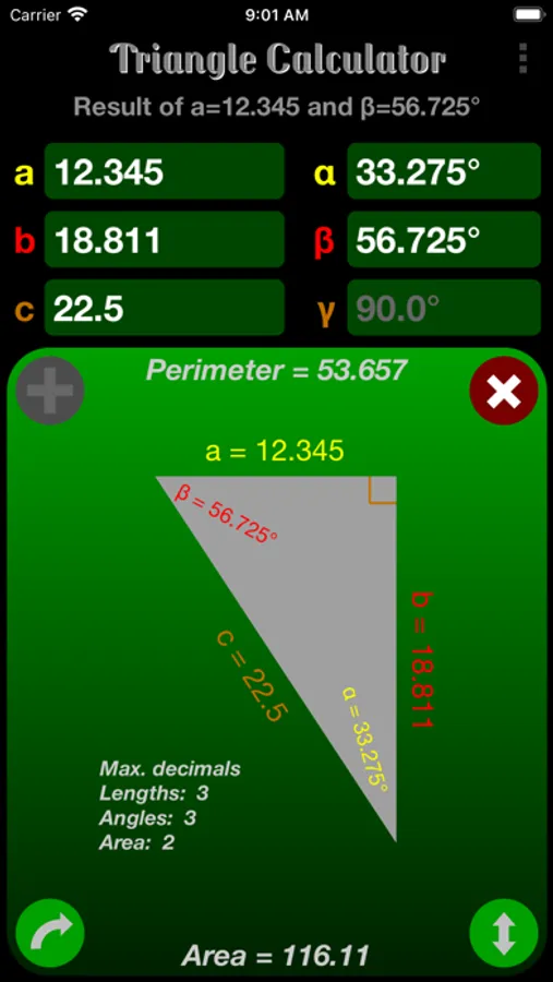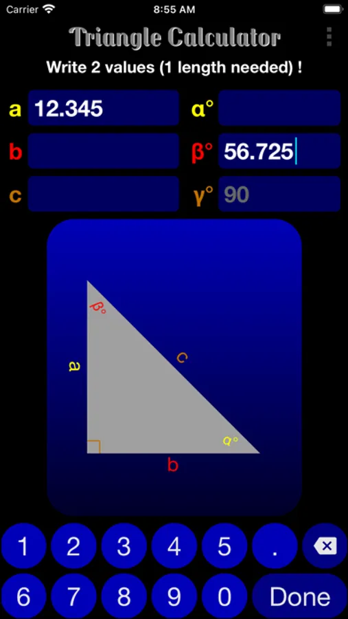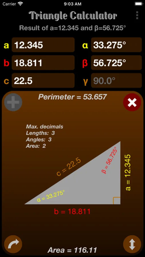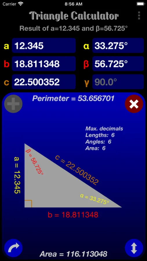 The application calculates the lengths, angles, area and perimeter of a right-angle triangle when only 2 values are known. A proportionally correct triangle is drawn according to calculations. The proportions of the triangle are consciously incorrect if any angle is too small. If the proportions are not OK a message alerts you to this. The shown triangle can be rotated and flipped. The number of decimals for lengths, angles, area and perimeter (according to lengths) can be specified. Note that the results may be rounded if they are to be used! It is possible to reuse and edit the most recently entered values after clearing. It is possible to change the color theme on backgrounds. Note that the results are given with a maximum of ~15 significant digits (all calculations are made in 64-bit double precision).