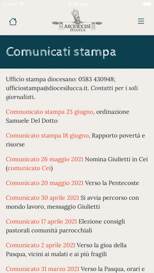 L'app "Arcidiocesi di Lucca" porta su smartphone e tablet i contenuti presenti sul sito diocesano, consentendo alla diocesi di comunicare con le persone vicine e lontane le notizie più recenti, le parole dell’Arcivescovo, le informazioni istituzionali, i contatti degli uffici, la possibilità di segnalare la propria presenza nelle chiese per la messa festiva.