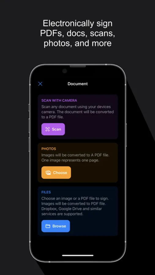 All document types are supported: PDFs, docs, spreadsheets, photos, files, camera scans — you name it. All documents are converted to PDF during the signing process.