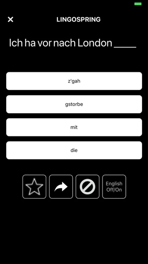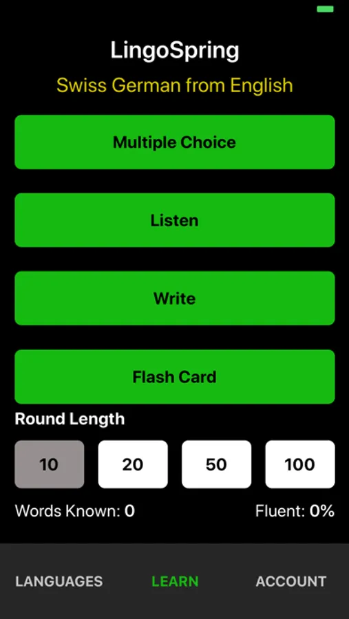 LingoSpring is the first mobile app that supports German and Swiss German. We have included features such as Multiple Choice, Listen, Write, and Flash Card modes, that help you practice all skills needed to become fluent in a language.