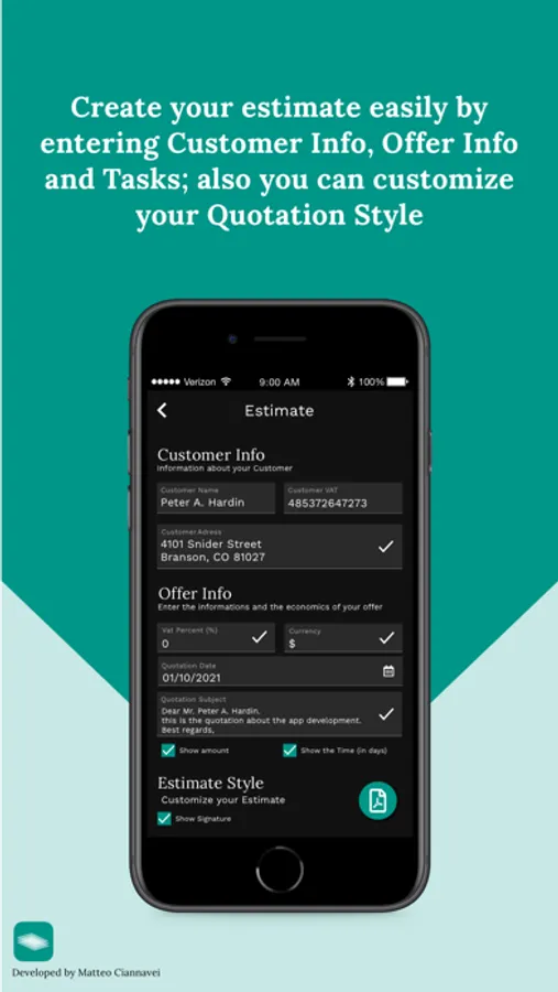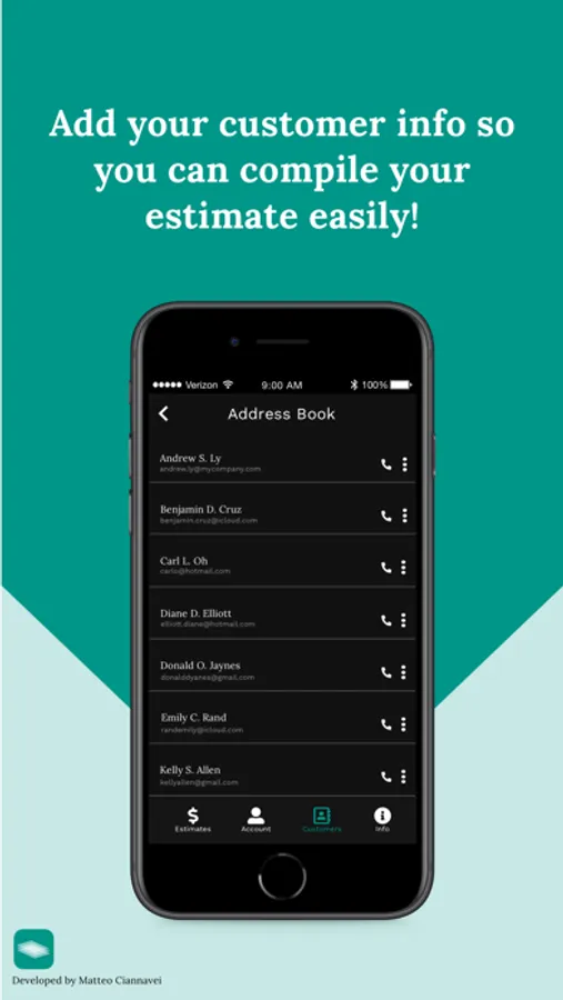 CUSTOMER ADDRESS BOOK: don't waste time retyping the details of your regular customers every time! With one click you can add your customer's information to the estimate!