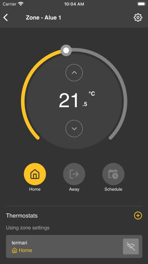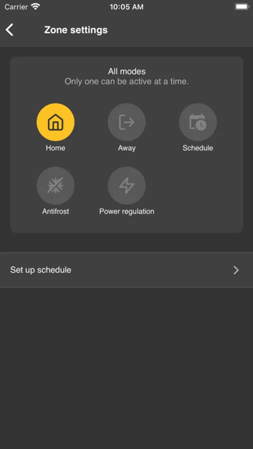 Application offers fast switching between Home, Away and Schedule modes, additionally Anti-frost and Power regulation modes are available. Weekly Schedule can be easily programmed with application.