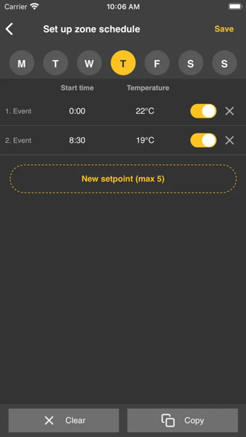 Temperature alarm limits can be configured for room and floor sensor. Alarms will be available even when application is closed as push notifications.