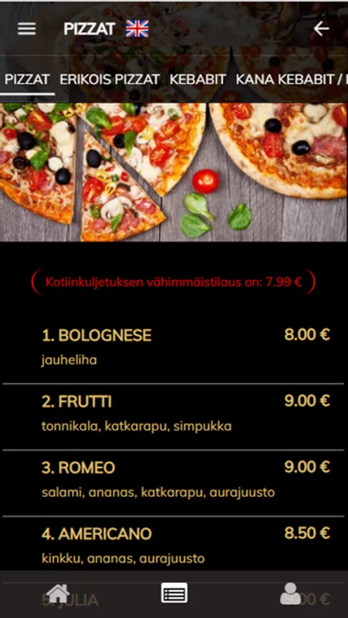 Golden Cafe Pizza ravintola-applikaation käyttöliittymä on helppokäyttöinen ja sen valikko on selkeä sekä