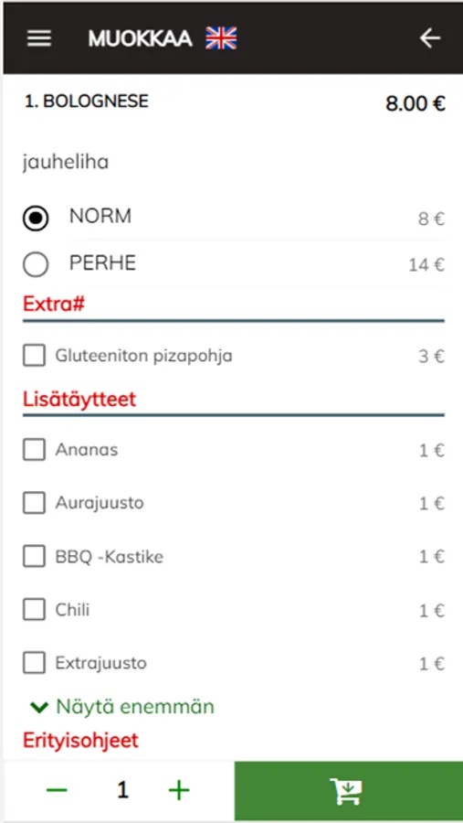 Valittuasi halutun ruoka-annoksen, lisäät sen ostoskoriin – tai valitset esim. lisätäytteitä. Voit tehdä vielä