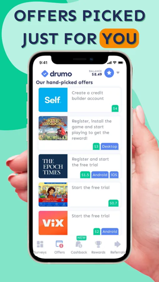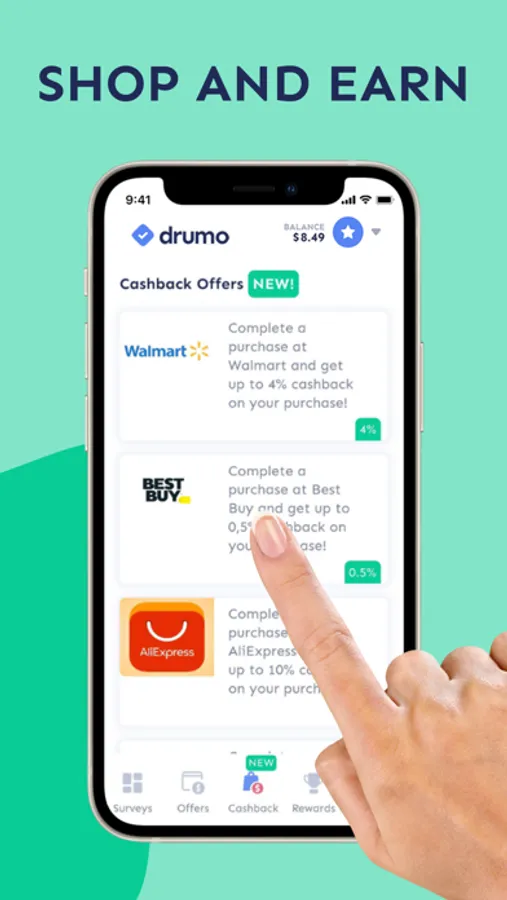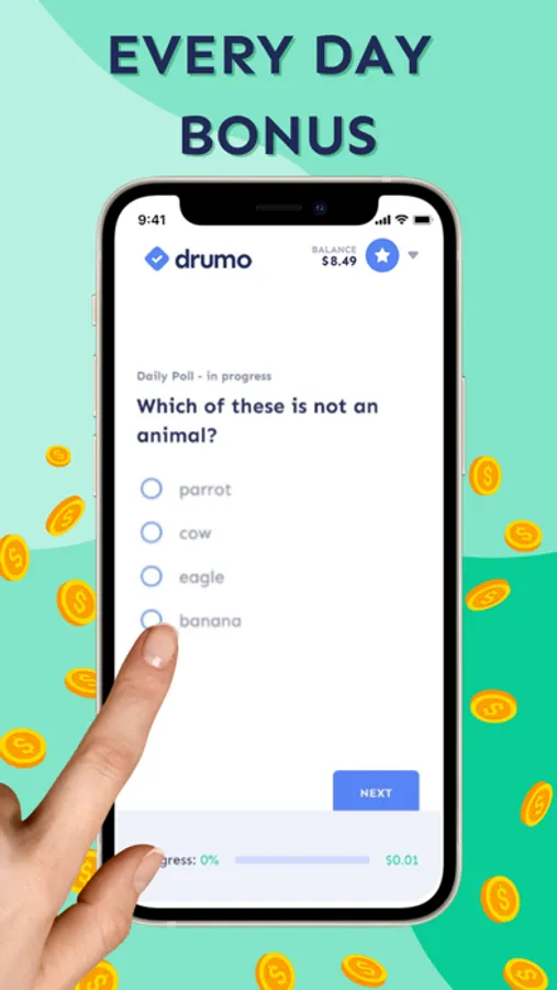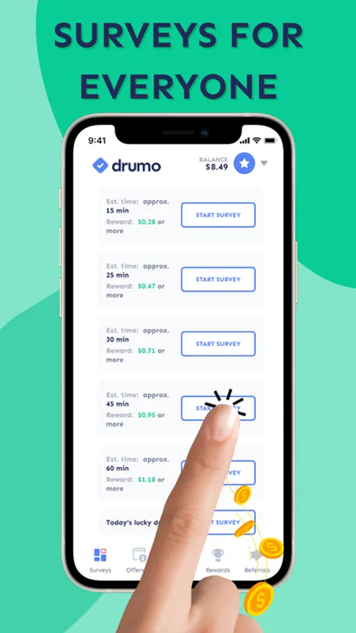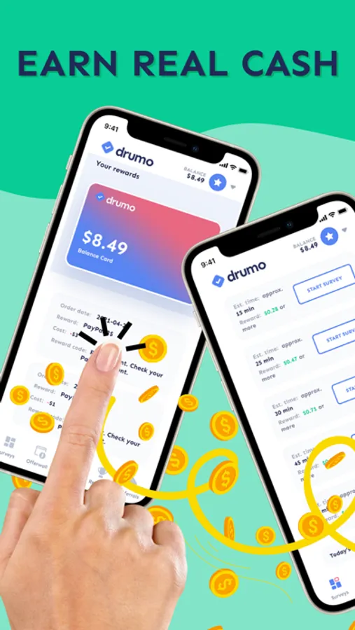 - Real cash, not points - On Drumo you'll find surveys that actually pay. There are no points, gems or any other virtual currency - your earnings are transferred to your Drumo account immediately when you complete a survey!