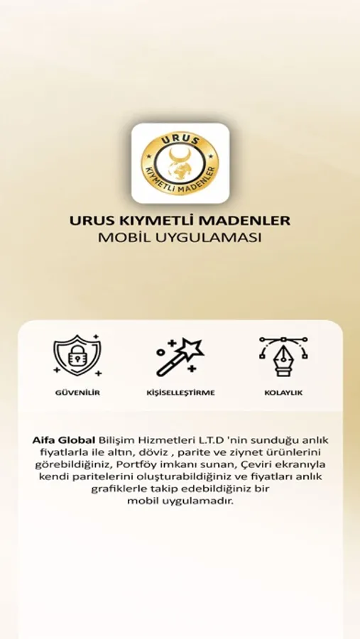 Aifa Global Bilişim Hizmetleri L.T.D 'nin sunduğu anlık fiyatlarla ile altın, döviz , parite ve ziynet ürünlerini görebildiğiniz , Portföy imkanı sunan, Çeviri ekranıyla kendi paritelerini oluşturabildiğiniz ve fiyatları anlık grafiklerle takip edebildiğiniz bir mobil uygulamadır.