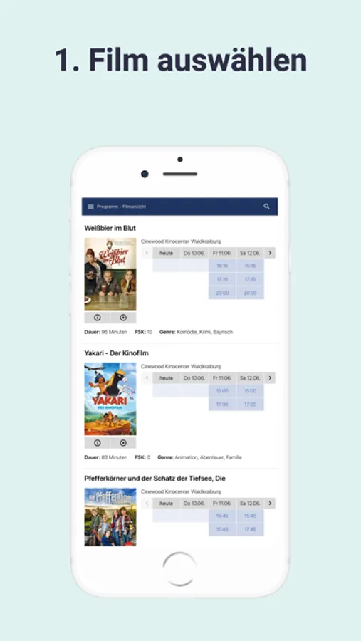 Hier kaufst Du in unter einer Minute Kinotickets für Deinen Lieblingsfilm. Schnell, sicher, einfach und ohne Anstehen an der Kinokasse. Einfach aus dem aktuellen Kinoprogramm Deinen Film buchen und Du erhältst die Tickets einfach & bequem als E-Ticket auf Dein Smartphone und an Deine E-Mail-Adresse.