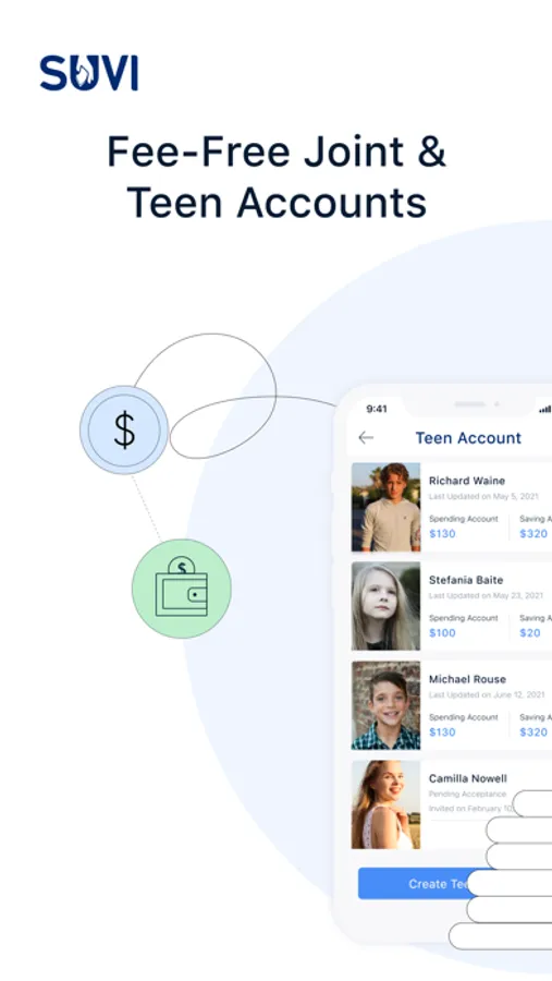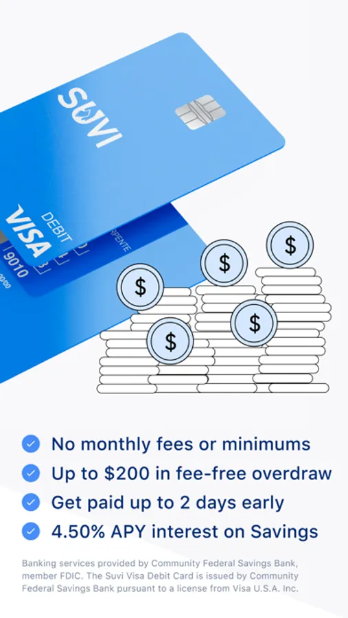 ^ Earn 4.50% Annual Percentage Yield (APY) on Suvi Savings Account on balances of up to $3,000 (including Pots linked to Savings Account and Teen Savings Account). APY is variable and may change at any time. To earn 4.50% APY, the Suvi Savings Account must meet the following requirements: $500 or more in qualifying direct deposits and debit card purchase transactions in the calendar month. In addition, the Suvi Checking Account and Suvi Savings Account balances must not drop below $0.00 on any calendar day of the month.