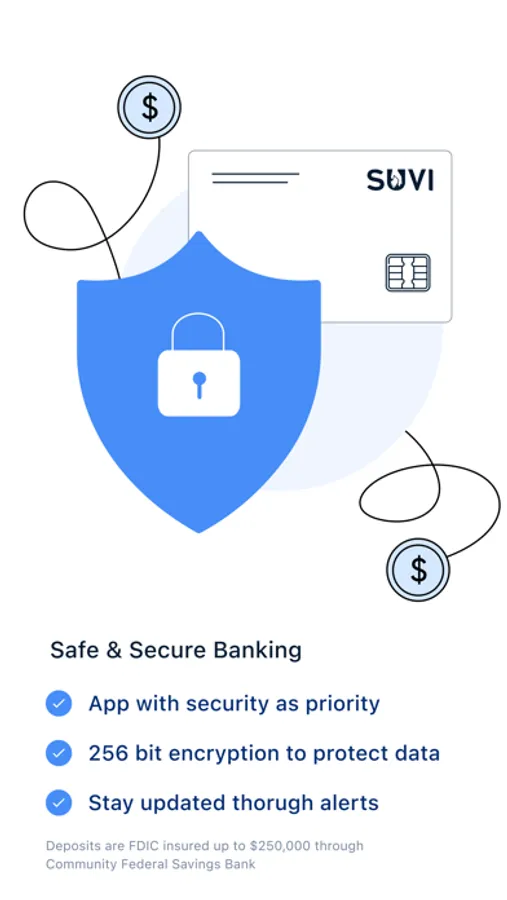 Banking services provided by Community Federal Savings Bank, member FDIC. The Suvi Visa Debit Card is issued by Community Federal Savings Bank pursuant to a license from Visa U.S.A. Inc.