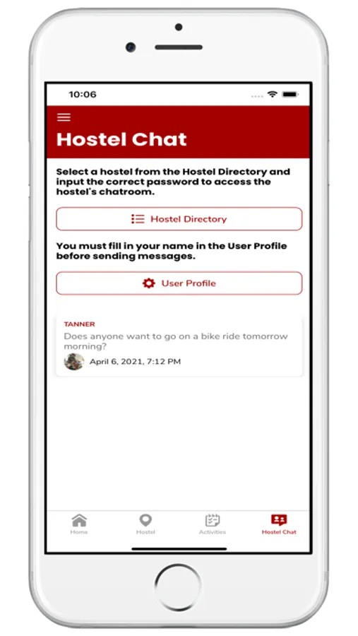 Guests will select the hostel they are staying at from a drop-down menu and input the hostel provided password. Guests will be able to: