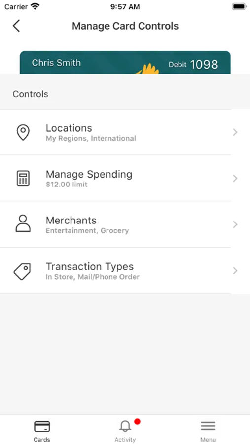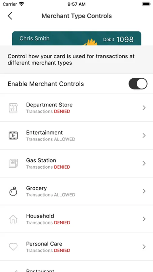 Spending limits can be established to allow transactions up to a certain dollar value and decline transactions when amounts exceed your defined thresholds. Transactions can be monitored and managed for specific merchant categories such as gas stations, department stores, restaurants entertainment, travel, and groceries. And your transactions can also be monitored for specific transaction types: in-store purchases, e-commerce transactions, mail/phone orders and ATM transactions.