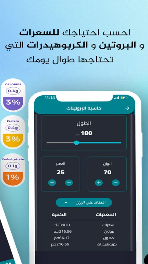 The app gives special care for your health as it provides you with all the requirements such as calories and protein calculator , it also allows you to know the nutritional value of many vegetables and fruits as well as the nutritional complements and how to best use them