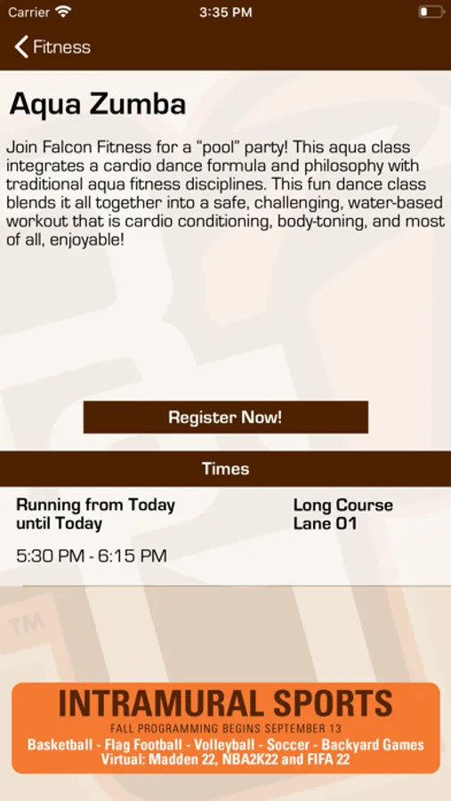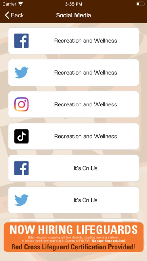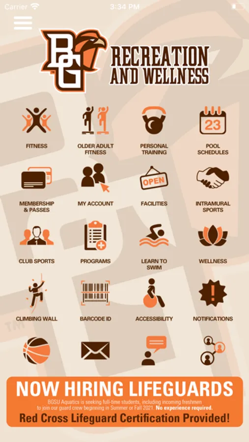 Programs include Aquatics (certification courses, learn to swim), Falcon Fitness (group exercise, small group training, #Move4YourMood, assessments and services, older adult fitness, personal training), Intramural Sports, Outdoor Program (trips, climbing wall, wilderness first responder training, team building), Club Sports, Health Enhancement Programs, Wellness Connection (late night events, peer education, programs and presentation on stress, self-care, nutrition, alcohol, tobacco, drugs, personal and campus safety, sexual health, sexual violence prevention, bystander intervention, fitness, body image), Youth and Family (kids camp, birthday parties), and Partnership Initiatives (BGSU Cares, Its On Us, Safe Communities of Wood County). Featured facilities are the Student Recreation Center, Perry Field House and outdoor recreation spaces.