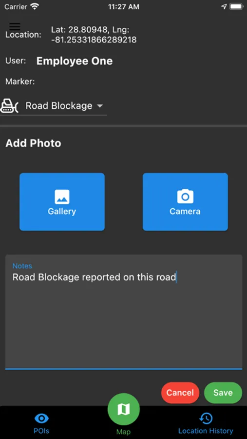 Users can select a POI and navigate to this location. The POIs are added by the project manager in the Web Interface. Once navigation is selected their current location is marked as last known working location for them to return to the exact location they left from.