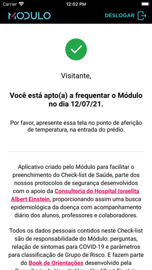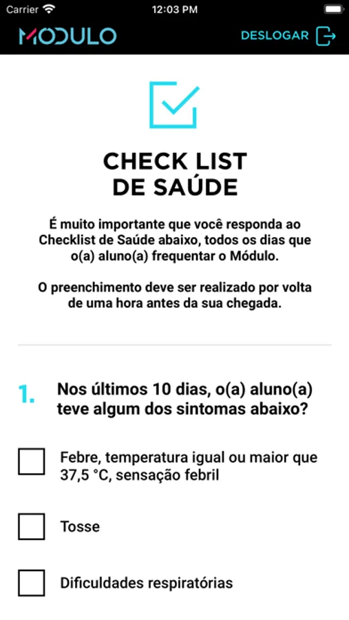Aplicativo para Checklist de Saúde diário que faz parte dos protocolos e medidas de segurança do Colégio Módulo, durante a pandemia do novo coronavírus.