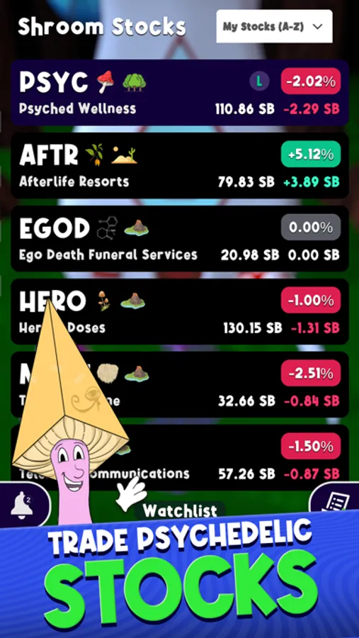 A stock market paradise waiting to be discovered! Play as Shroomy, a young mushroom who hopes to achieve financial freedom by investing in the psychedelic stock market. Equipped with several tools to make sound investment decisions, Shroomy ventures into the vast world of stock trading. With the loving support of his family and neighbours, Shroomy is destined for success in the market!