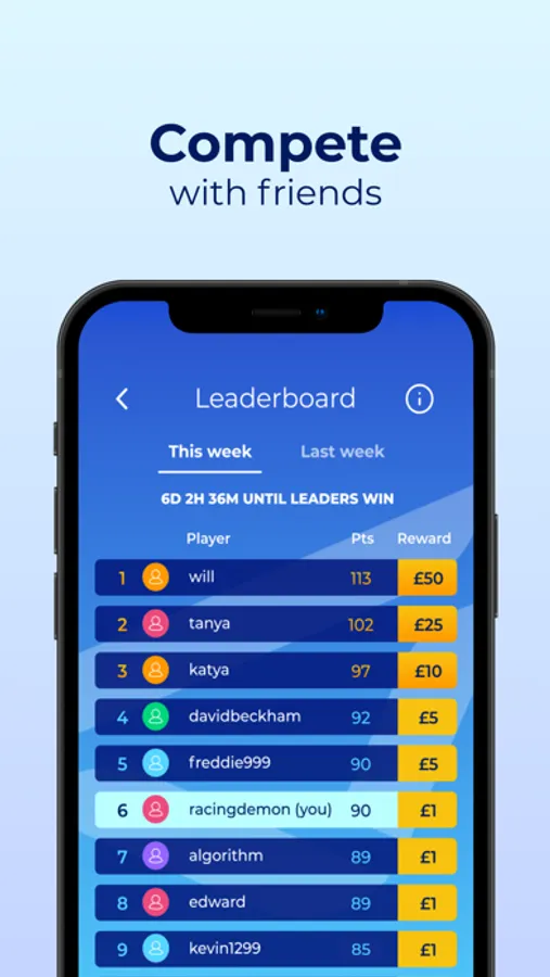 • Weekly leaderboards with guaranteed prizes every Monday