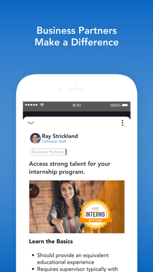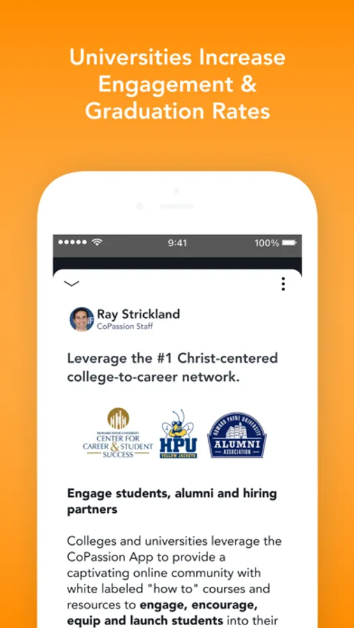 CoPassion is a powerful faith-driven network and community for all college students and recent graduates to discover and fulfill their calling in Christ. We partner with private and public universities, campus ministries, churches, faith-driven businesses and not-for-profits.