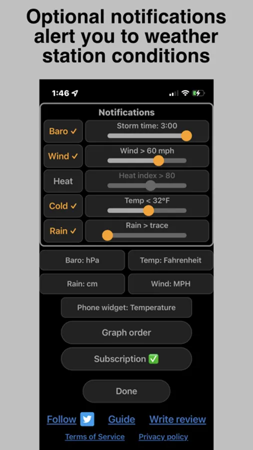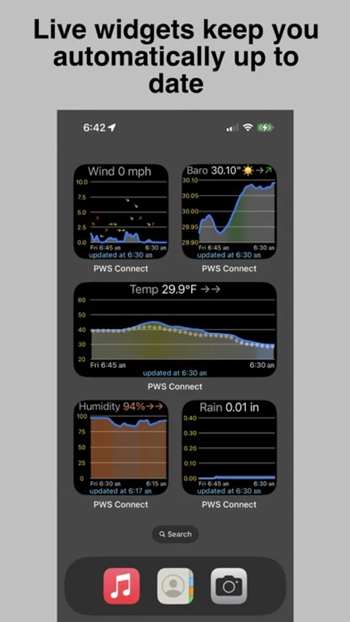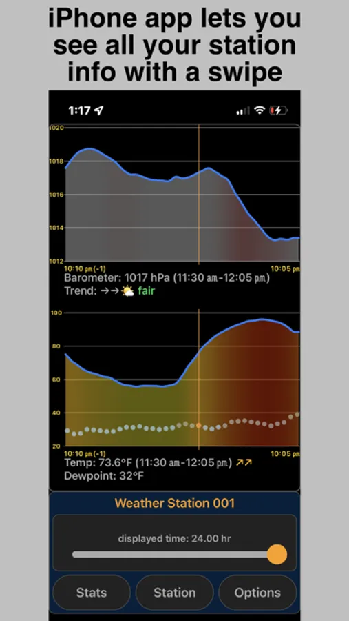 PWS Connect maintains a detailed 24-hour weather station data log that is regularly updated in the background. No more having to open an app to see what's happening with your station! The app displays trends for barometric pressure, temperature, wind, and humidity with beautiful, informative, and fully interactive graphs on your iPhone and Apple Watch. PWS Connect provides notifications and alerts for conditions such as high and low temperatures, pressure changes, and precipitation. PWS Connect supports iPhone widgets and all Watch complication styles to keep you up to date on weather conditions at a glance, and currently supports Weather Underground, Davis WeatherLink, Ambient Weather, and Aeris Weather/PWS Weather networks.