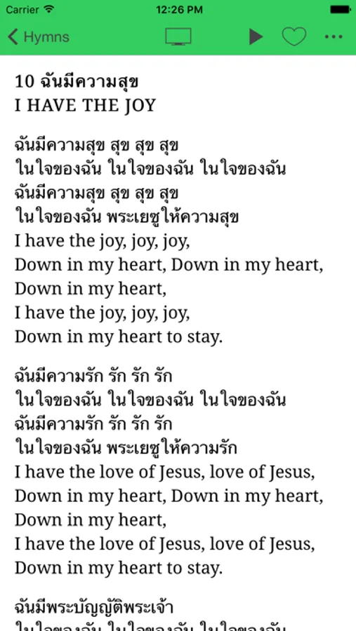 Original Thai lyrics with corresponding English for most hymns.