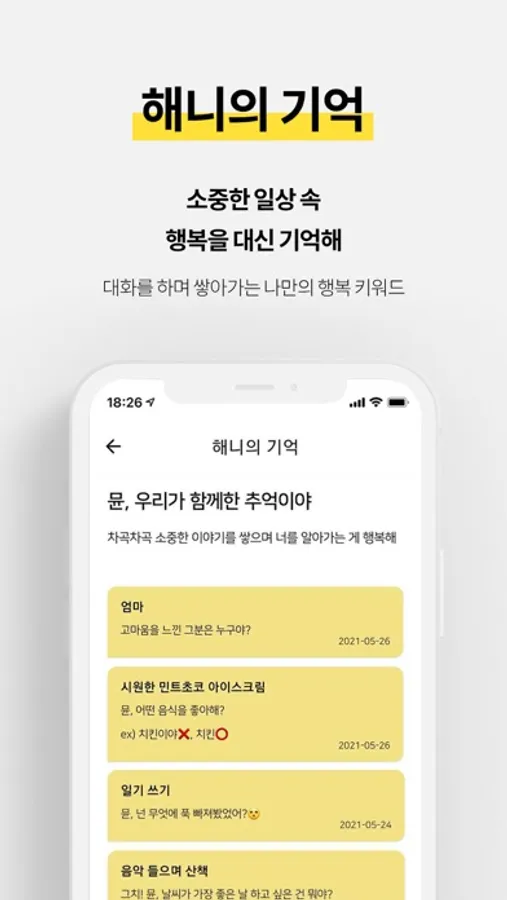 친구 같은 해니와 1분 일상 대화를 통해 누구나 쉽게 셀프 멘탈 케어를 할 수 있습니다.