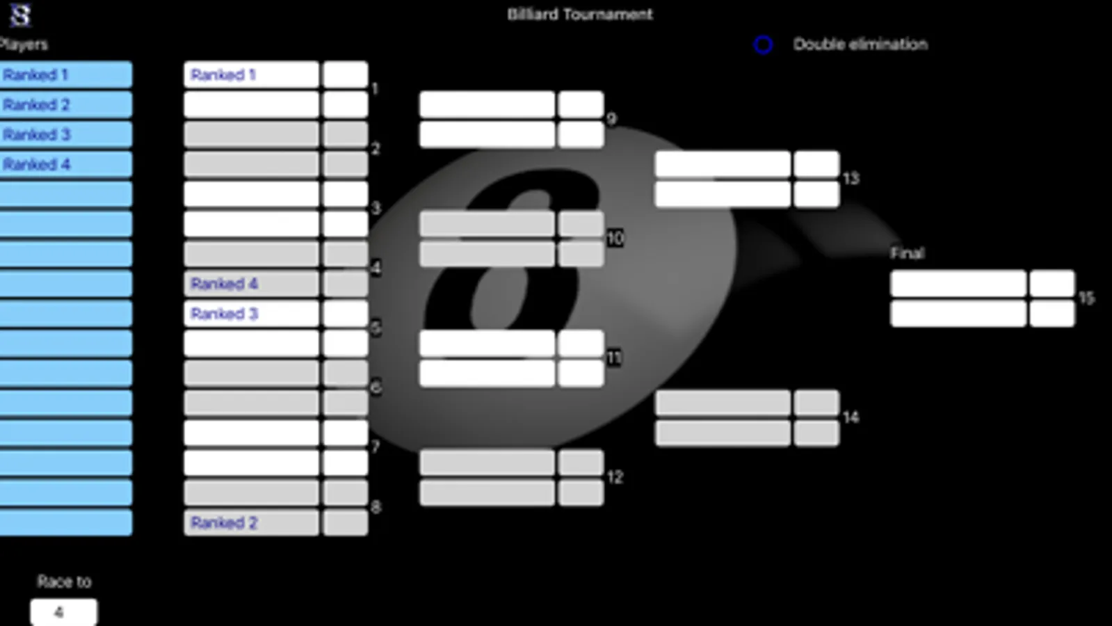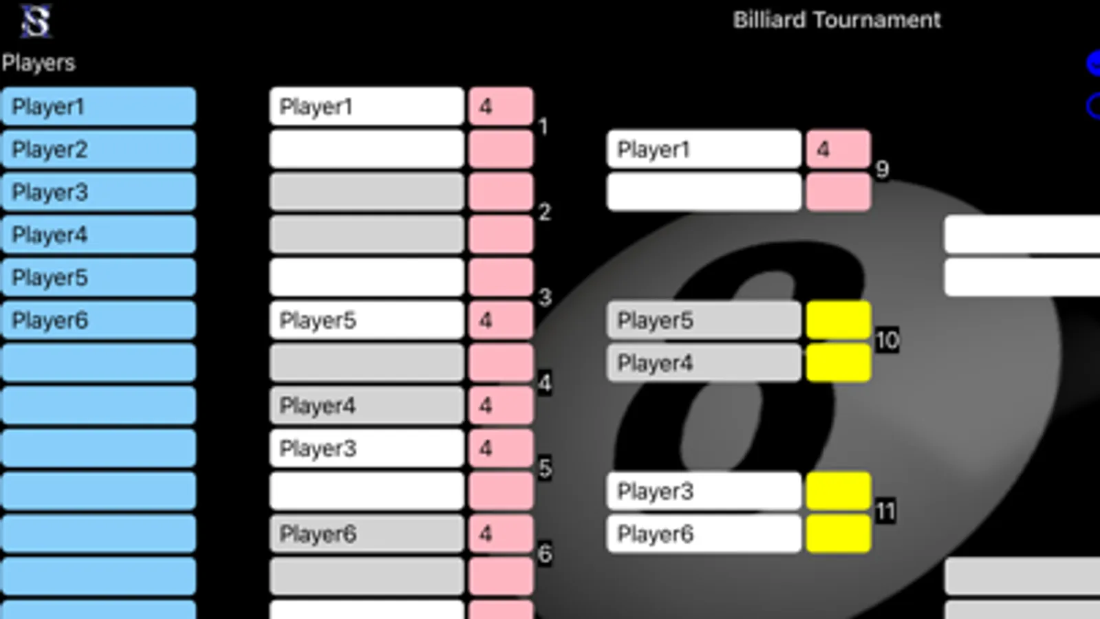 Billiard Tournament is an App to organise billiard tournament. The competition chart is automatically filled and the results are updated automatically.