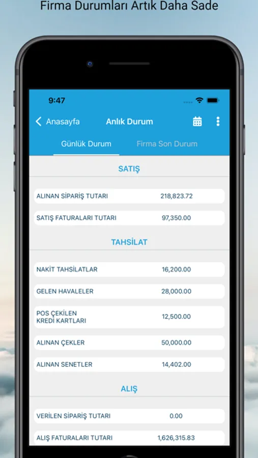 Bilgisayar kullanımına gerek kalmadan carilerinizin; detaylı ve detaysız ekstrelerini, siparişlerini, tekliflerini görüntüleyebilirsiniz. Firmanızın günlük durumunu ve yıllık durumunu raporlarımız ile daha yalın görebileceksiniz.