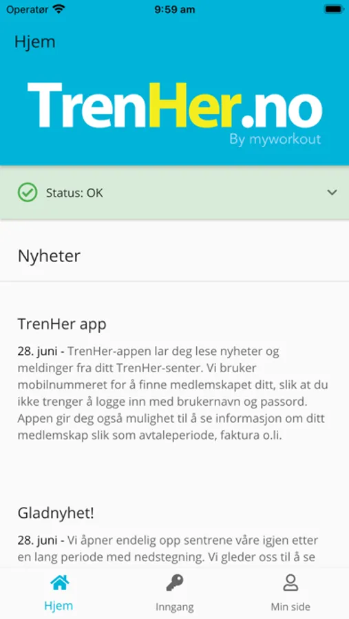 This is the app for your TrenHer fitness center! Use your mobile phone to read news, get access to the center and get an overview of your invoices.