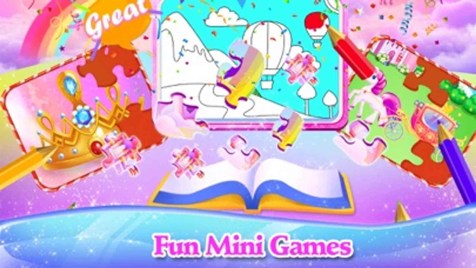 Once upon the time, a pretty princess was living in a rainbow unicorn town alone. She was so eager to find her prince. So she tried to make her town colorful and fun. She created so many fun princess activities to awake her prince. And at last, the prince appeared and they love each other forever. Now, let’s go to the princess & prince mini town to experience their love journey. Let’s get started.