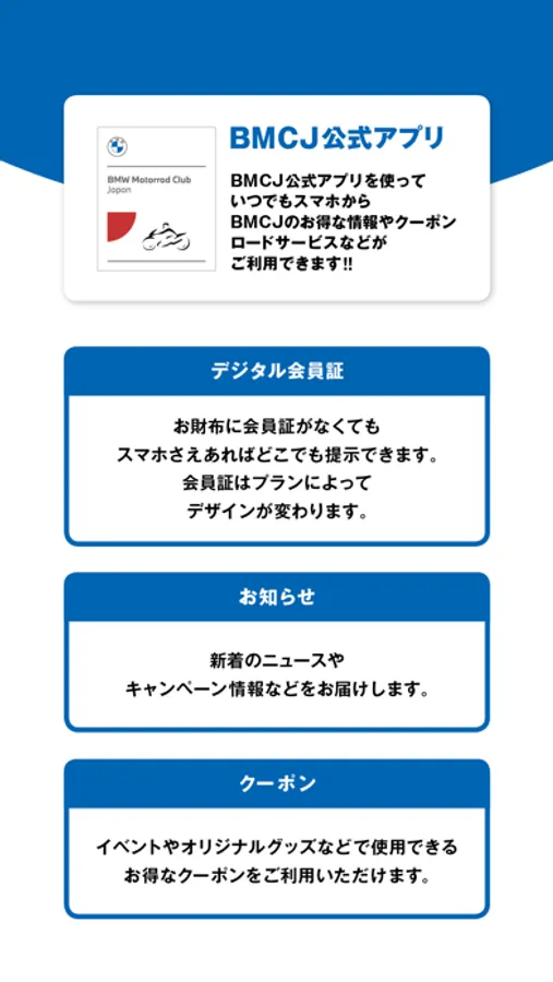 ※このアプリは非会員の方でも登録可能です。BMCJのイベント情報やお知らせをチェックできます。ただし、会員様特典であるロードサービスの利用などはできませんので、ご了承ください。