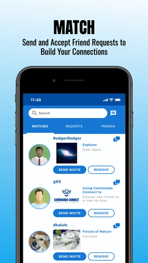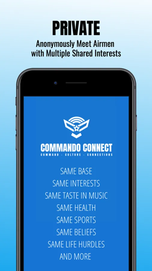 The rigors of Air Force life are demanding. Multiple deployments and long shifts leave little time to find and friend Airmen that share your interests, stage of life, favorite activities, sports, and more. Now, imagine an app that can instantly power up your network connections with Airmen you were meant to meet. This is where the Commando Connect app steps in. We hand you the controls and make it easy to privately match and connect with Airmen on multiple topics of mutual interest whether they are located on your base or around the world.