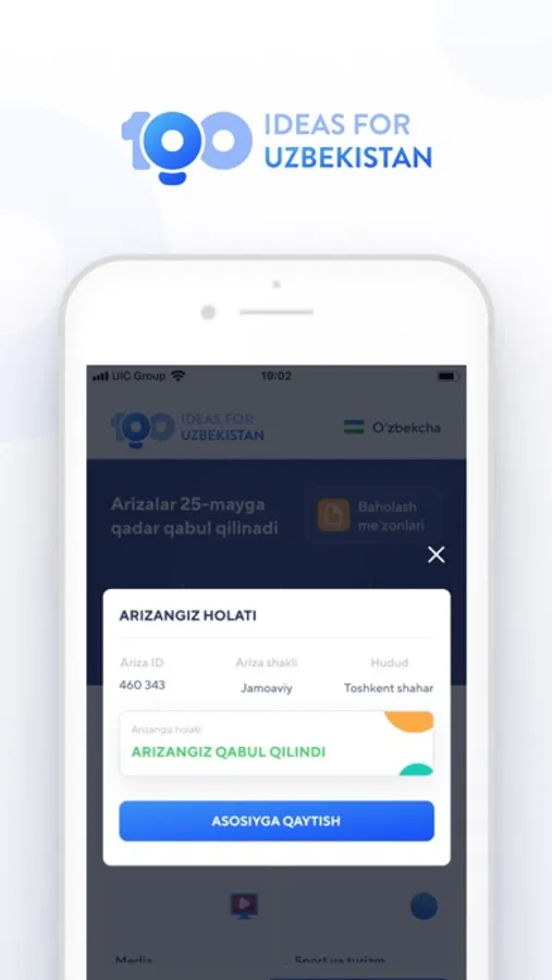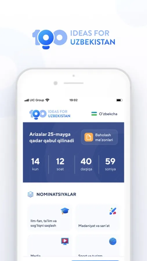 Har bir hududda, birinchi bosqich natijalariga ko‘ra, taqdim etilgan loyihalardan 1400tasi tanlab olinadi, ular o‘z hududida g‘oliblik uchun kurash olib boradi. Keyinchalik ular orasidan butun respublika bo‘ylab g‘oliblik uchun kurashadigan 100ta loyiha saralab olinadi. Yakunda esa 100 nafar g‘olib – O‘zbekiston taraqqiyoti uchun xizmat qiladigan eng yaxshi 100ta g‘oya e’lon qilinadi. Ular moliyaviy qo‘llab quvvatlanadi.