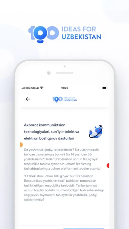 Mazkur loyiha orqali yoshlar o‘z ishlanmalarini jamoatchilik, mutaxassislar bilan bo‘lishish hamda mamlakatni yangi darajalarga olib chiqib, O‘zbekiston taraqqiyotiga o‘z hissasini qo‘shish imkoniga ega bo‘lishadi.