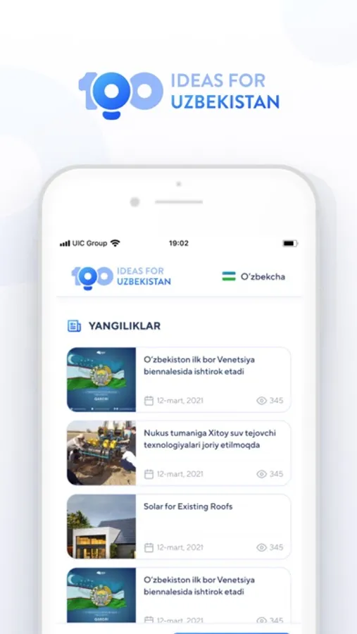 2021-yilning iyun oyida Yoshlar ishlari agentligi, Innovatsion rivojlanish vazirligi hamda IT-park tomonidan tashkil etilayotgan yirik yoshlar loyihasi – “O‘zbekiston uchun 100ta tashabbus”ga start berildi. Unda yosh yigit-qizlar respublikani rivojlantirish g‘oyalari haqida gapirib berishadi va o‘zlarining loyihalarini taqdim etishadi.