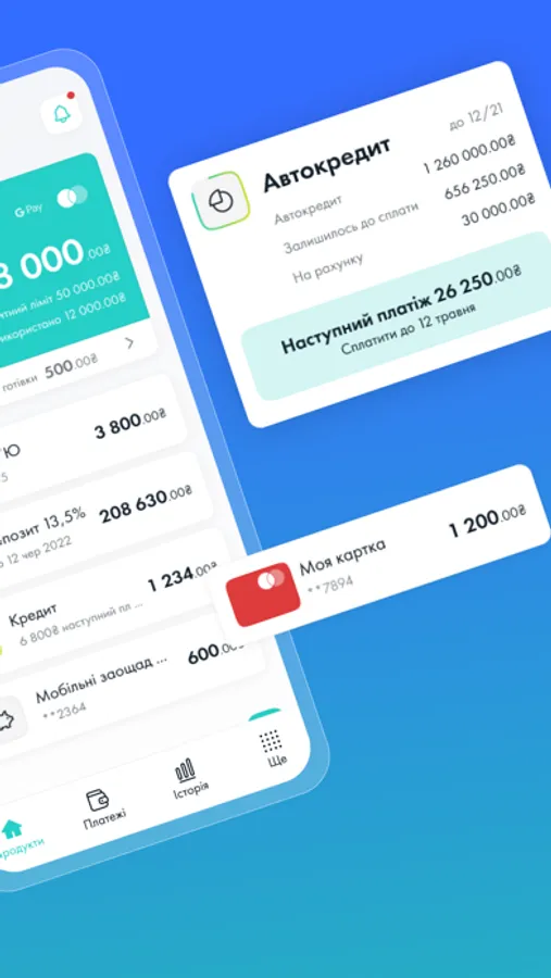 • Деталізовано інформацію по продуктах та історії операцій для кредитів, депозитів, та поточних рахунків.