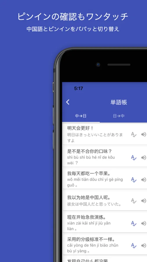 翻訳結果は全てピンイン付きで、さらに読み上げ機能もあります。