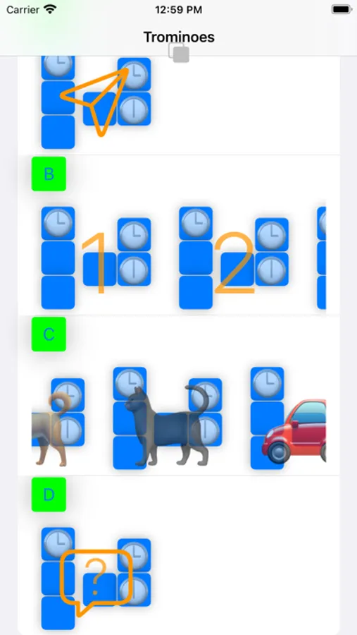 Each tromino puzzle has a grid of green squares and some blue trominoes. You have to fit all the trominoes on the grid with no overlapping and without leaving any empty squares, a bit like a jigsaw puzzle. You can even event your own shapes.