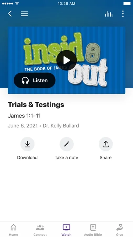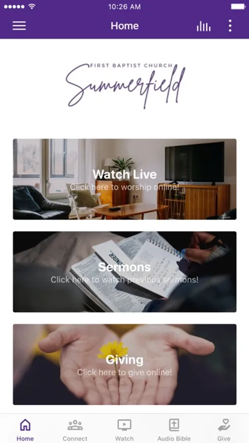 This app will help you stay connected with the day-to-day life of our church. With this app you can: watch or listen to past messages; see upcoming events; stay up to date with push notifications; share your favorite messages via Twitter, Facebook, or email; and download messages for offline listening. You can also share prayer requests, so our staff might pray for you and your needs. You're also able to access our online giving platform to safely and easily give your tithes and offerings.