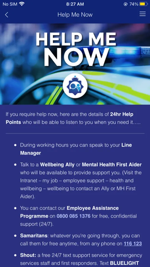 The App covers a range of problems faced by officers and staff in the Police service, such as anxiety, stress, PTSD (Post Traumatic Stress Disorder), depression, eating disorders, self-harm and more. It gives practical advice and support on how officers can maintain good mental health, spot warning signs for themselves and others, plus advice on how to get help for themselves and colleagues.