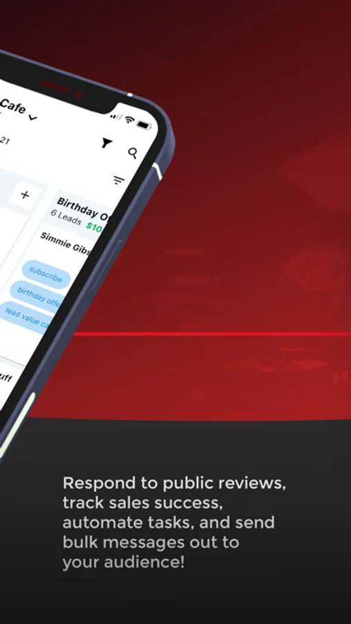 In our mobile app, users can easily chat with their leads and customers across multiple channels, respond to public reviews, track their sales success, automate tasks, and send bulk messages out to their audience!